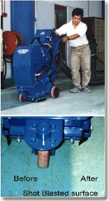 EPP Flooring System can help you to rehabilitates your existing concrete floors through surface blasting and/ or grinding. Surface blasting is a cleaning process by propelling a stream of abrasive material against the surface. This process helps eliminate the use of organic solvent stripping. |